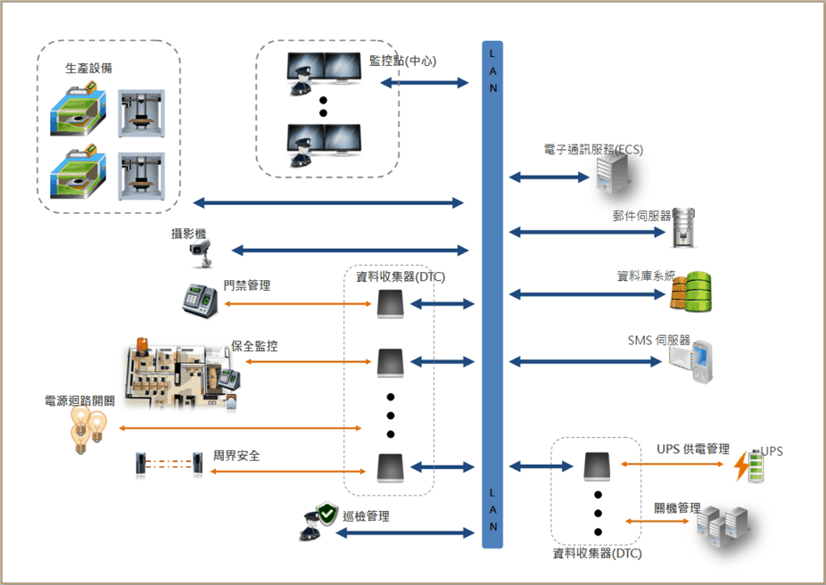將原各自分散的監控管理系統,進行有效率的統合監控。 之所以能進行有效率的監控主要是運用了IT技術、網路及資料收集器(DTC),來收集現有的生產機器設備、資訊安全設備及作業環境安全信息的資訊。