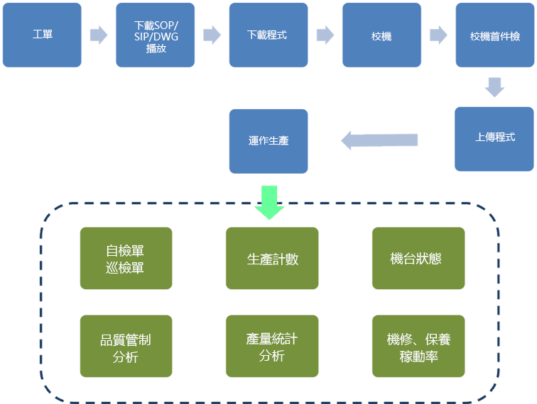 機臺編程管理,結合MES系統作生產管控,加上產能訊息回寫ERP,最後再將產線品質管理與報修資訊全部連結起來。
